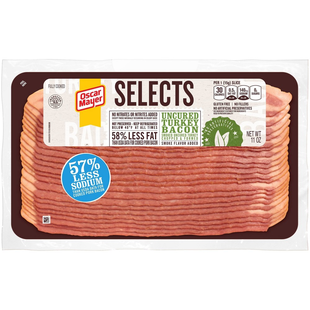 Oscar Mayer Turkey Bacon - Instacart Oscar Mayer Smoked Cured Gluten Free Fully Cooked Turkey Bacon is vacuum packed in 4 resealable 12-ounce packages with 71-73 slices total. • Four 12 oz package of Oscar Mayer Turkey Bacon Smoked Cured Turkey, Chopped & Formed, Smoke Flavor Added, with 62% Less Fat & 57% Less Sodium Than USDA Data for cooked pork bacon, 71-73 slices. Calories in Oscar Mayer Turkey Bacon - Fitbit Comprehensive nutrition resource for Oscar Mayer Turkey Bacon. Learn about the number of calories and nutritional and diet information for Oscar Mayer Turkey Bacon. This is part of our comprehensive database of 40,000 foods including foods from hundreds of popular restaurants and thousands of brands. Oscar Mayer Turkey Bacon Nutrition Facts • MyFoodDiary® 180 calories. Log food: Oscar Mayer Turkey Bacon Bits. 1 tbsp (7g) Nutrition Facts. 20 calories. Log food: Oscar Mayer Uncured Turkey Bacon Selects. 1 slice (15g) Nutrition Facts. 30 calories. Log food: Eat better. Feel better. Learn more MyFoodDiary. Top brands. Trader Joe's; Oscar Mayer Turkey Bacon: calories, nutrition analysis & more ... Personalized health review for Oscar Mayer Turkey Bacon: 35 calories, nutrition grade (C plus), problematic ingredients, and more. Learn the good & bad for 250,000+ products. Alternatives. 8 better options. Jones Uncured Turkey Bacon; Applegate Naturals Turkey Bacon, Uncured;