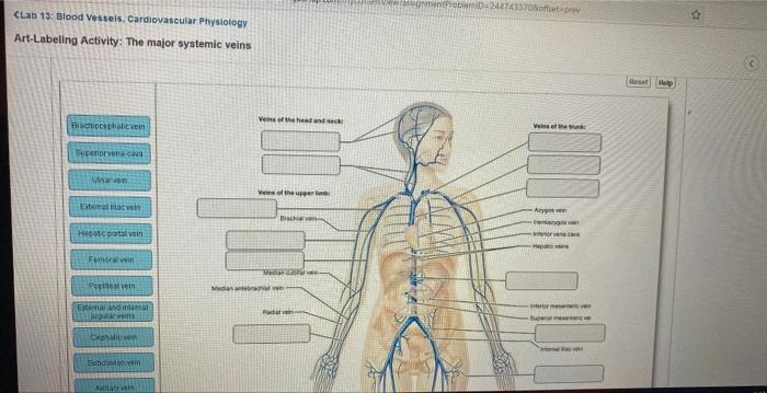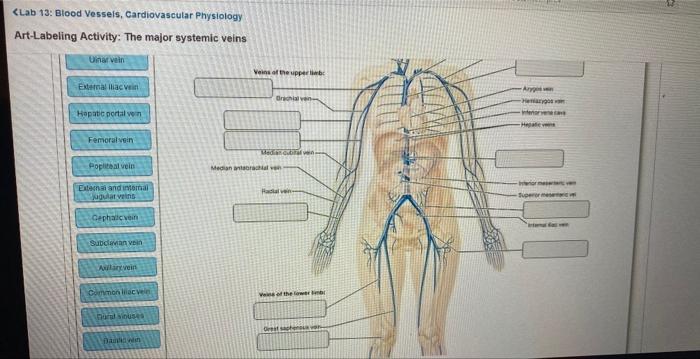 20.1 Structure and Function of Blood Vessels - OpenStax Arteries and veins transport blood in two distinct circuits: the systemic circuit and the pulmonary circuit (Figure 20.2). Systemic arteries provide blood rich in oxygen to the body's tissues. The blood returned to the heart through systemic veins has less oxygen, since much of the oxygen carried by the arteries has been delivered to the cells. Overview of the Major Systemic Arteries Diagram - Quizlet Start studying Overview of the Major Systemic Arteries. Learn vocabulary, terms, and more with flashcards, games, and other study tools. Blood vessel LABS Flashcards | Quizlet The major systemic veins veins and arteries of the head Blood vessels of the upper limb Blood vessels of the lower limb Blood vessels of the abdomen Drag each label into the appropriate position to identify whether the characteristic is indicative of arteries or veins. Solved Art-labeling Activity: An Overview of the Major - Chegg Art-labeling Activity: An Overview of the Major Systemic Veins, Part 1 of 3 Drag the labels onto the diagram to identify the major systemic veins. Reset Help Cephalic Subclavian Axillary Median antebrachial Ulnar Basilic Radial Median cubital Palmar venous arches Hepatic veins Brachial Digital veins This problem has been solved!