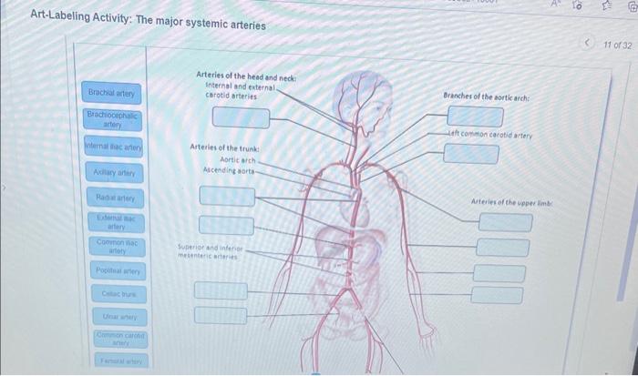[Solved] Art-Labeling Activity: The major systemic | SolutionInn Art-Labeling Activity: The major systemic arteries Part A Drag the appropriate labels to their respective targets. Common iliac artery Brachial artery Ulnar artery Internal iliac artery Femoral artery Popliteal artery Celiac trunk Radial artery Descending aorta Axillary artery Brachiocephalic artery External iliac artery Left subclavian artery Common carotid artery Arteries of the head and ...