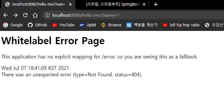 코딩창고 코딩창고 Springboot-mustache 404 PageNotFound 에러발생 - 정리하는 개발자 Maven 3.6.3 ## 현상 Contoller 에서 /cluster/dashboard 로 접속이 되면 /templates/cluster/cluster_dashboard.html 으로 매핑이 되어야 하는데 404 PageNotFound 에러발생 Whitelabel Error Page This application has no explicit mapping for /error, so you are seeing this as a fallback. Mon Dec 28 20:28:26 KST 2020 There was an unexpected error (type=Not Found, status=404). 404 Page Not Found Error: What It Is and How to Fix It - Lifewire How to Fix the 404 Not Found Error Retry the web page by pressing F5, clicking/tapping the refresh/reload button, or trying the URL from the address bar again. The 404 Not Found error might appear for several reasons even though no real issue exists, so sometimes a simple refresh will often load the page you were looking for. Spring Boot - 스프링 부트 Whitelabel 에러 처리 방법 사용자 정의 오류 페이지를 추가하는 것과 별개로 스프링 부트에서 사용되는 whitelabel을 비활성화하는 방법이 있습니다. whitelabel을 사용하지 않고 원시적인 오류 처리를 확인하고 싶으신 경우에 사용하시면 됩니다. properties 혹은 yaml을 이용해 whitelabel 비활성화 설정하기 - application.properties server.error.whitelabel.enabled=false - application.yml server: error: whitelabel: enabled: false
